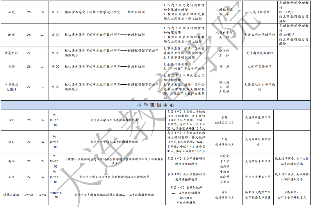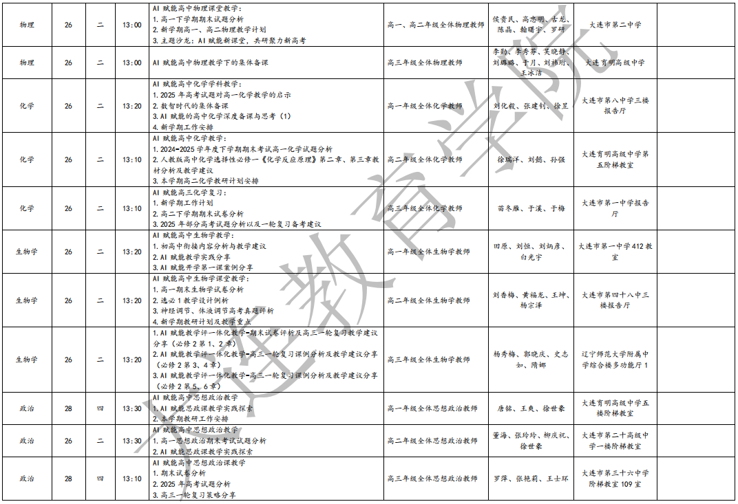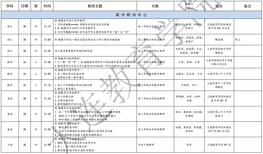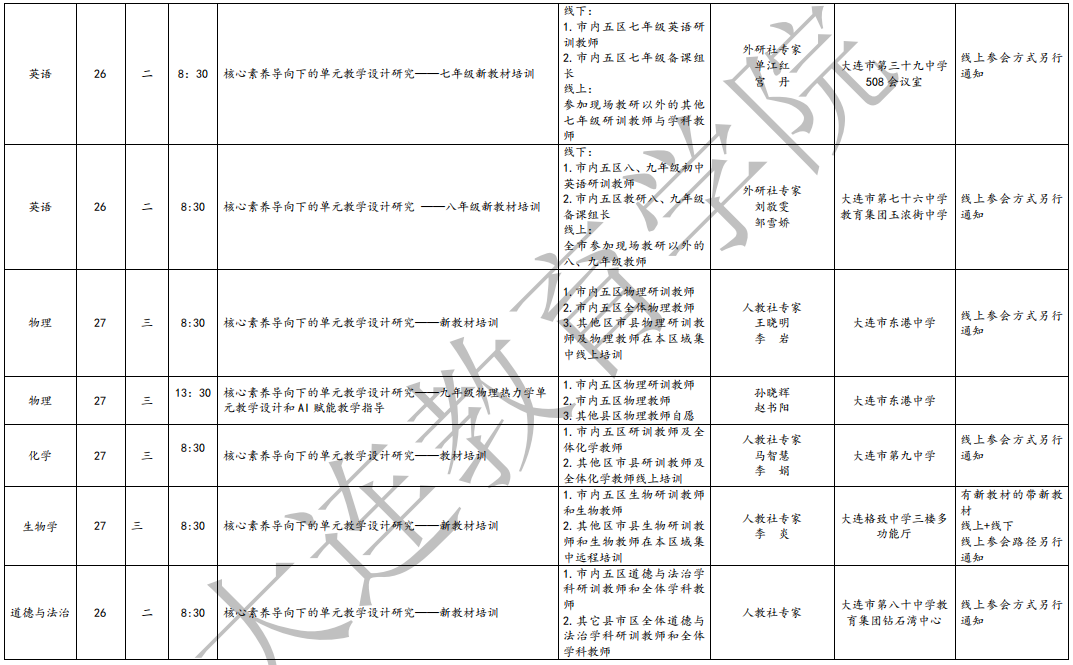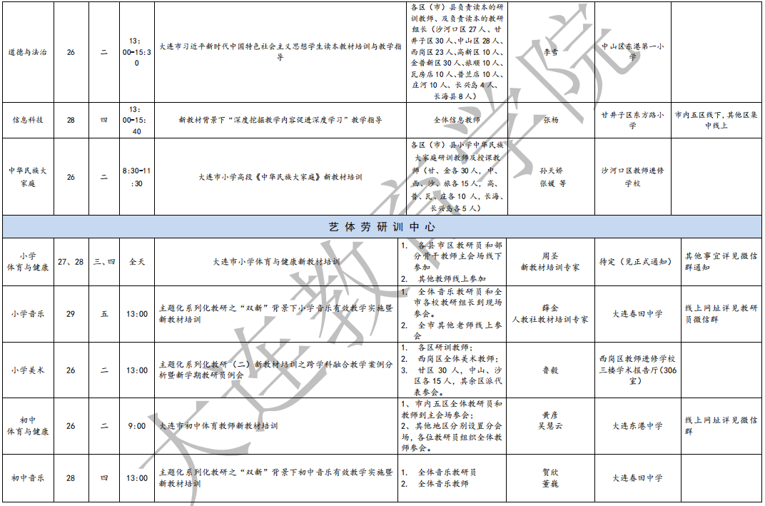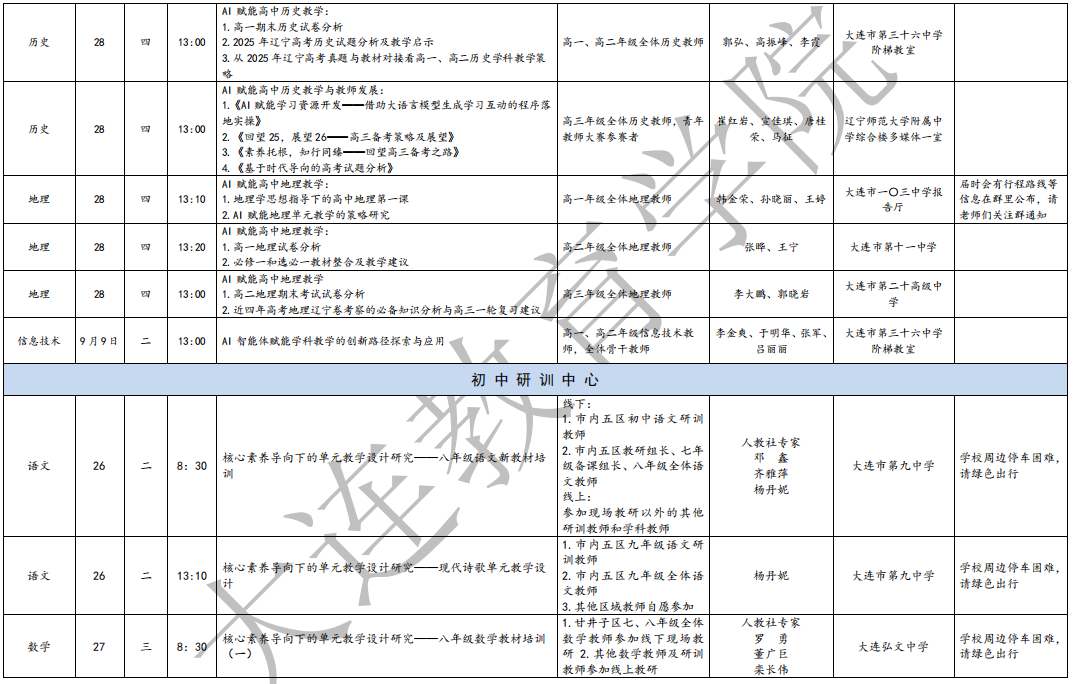 大连教育学院2025年8月教研活动一览表